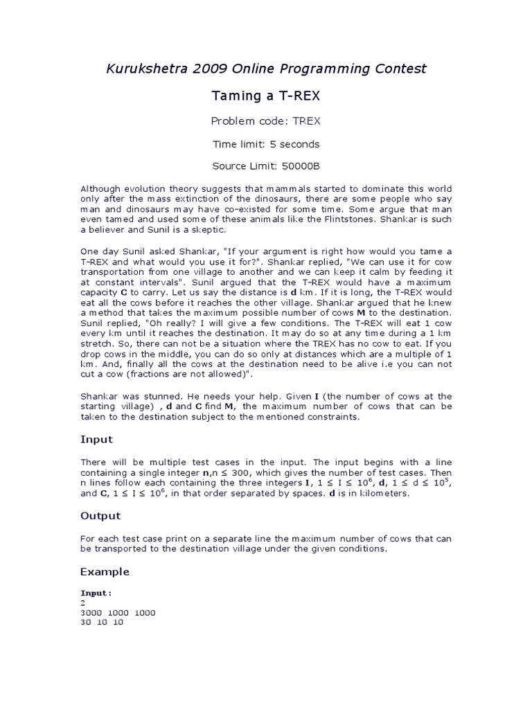 Kurukshetra 2009 Online Programming Contest Taming A T-REX: Problem ...