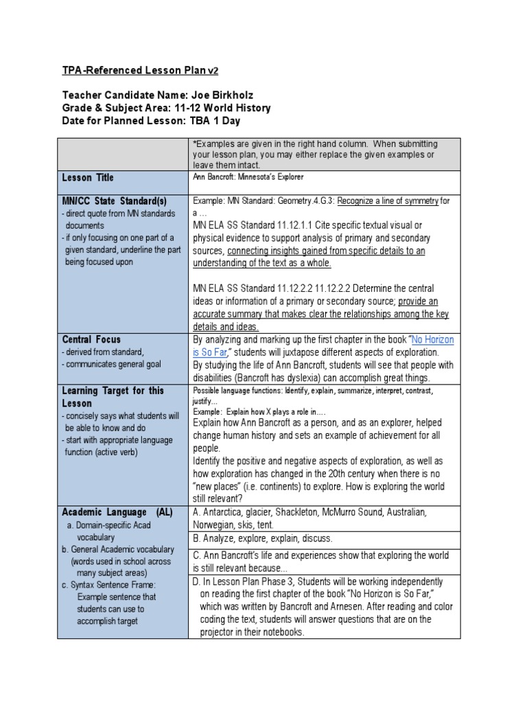 TPA-Referenced Lesson Plan Teacher Candidate Name: Joe Birkholz Grade ...