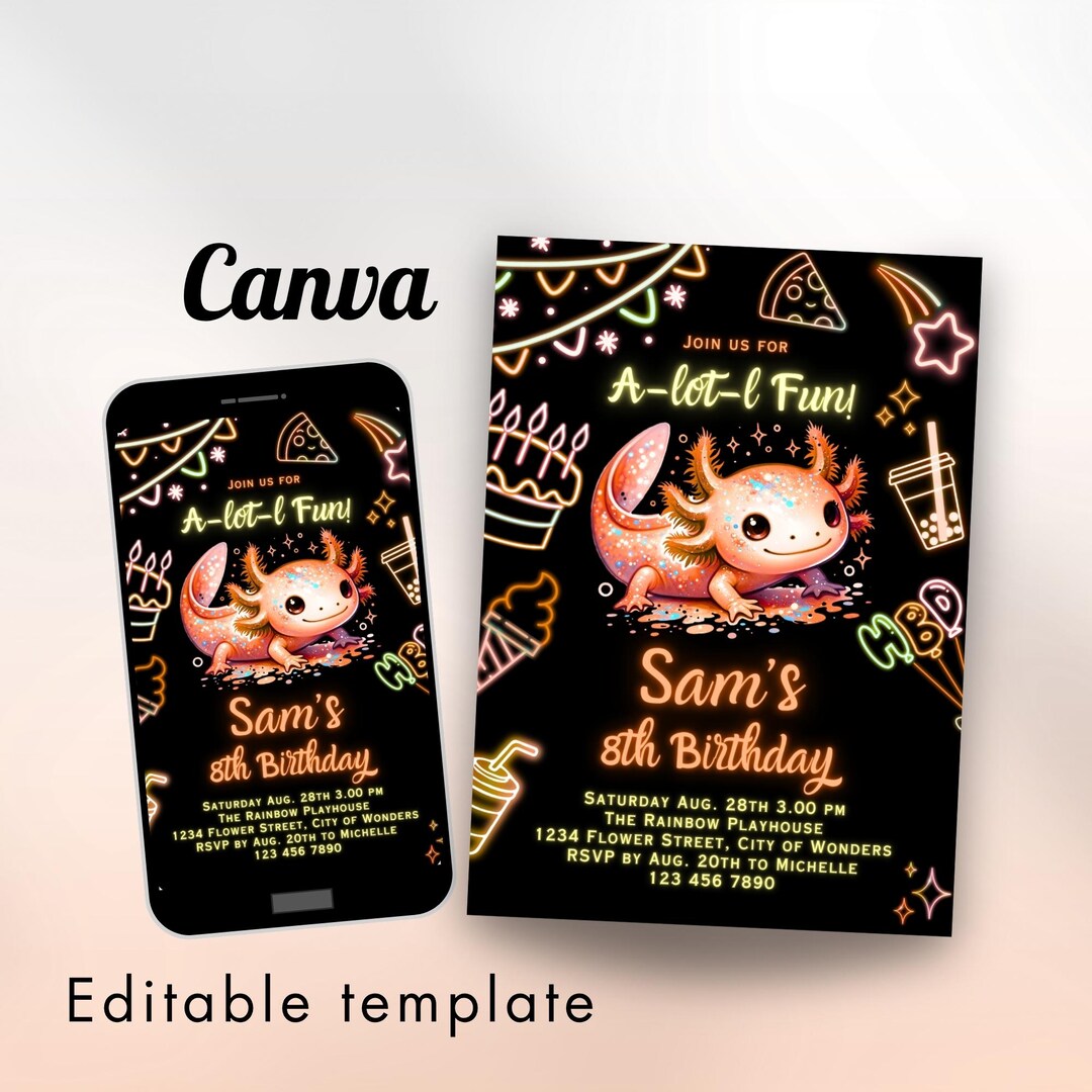 Axolotl Birthday Invitation Template Orange Neon Glow Axolotl Digital ...