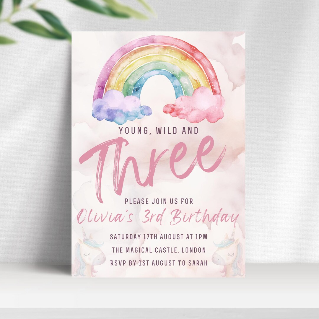 Young Wild and Three Birthday Invitation - Rainbow & Unicorns, 3rd ...
