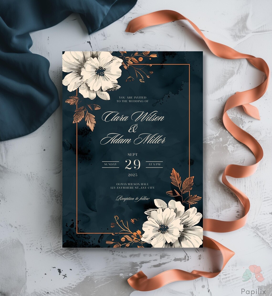 Dark Teal and Copper Floral Wedding Invitation, Elegant Watercolor ...
