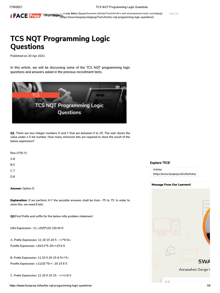 Programming MCQ and Coding Solutions for TCS NQT 2021 Official Sample ...