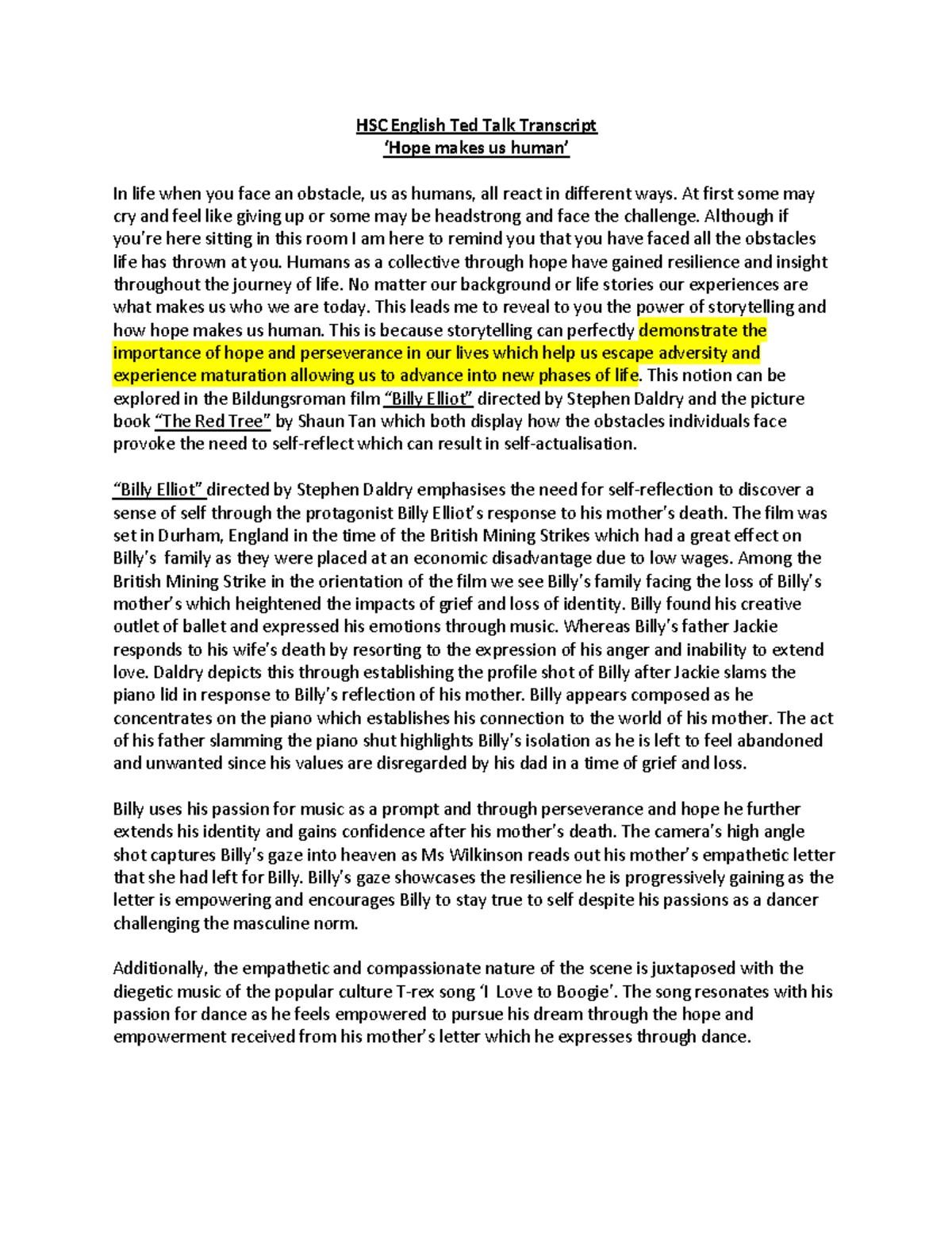 Ted Talk Transcript - Related Text The Red Tree For Billy Elliot - HSC ...