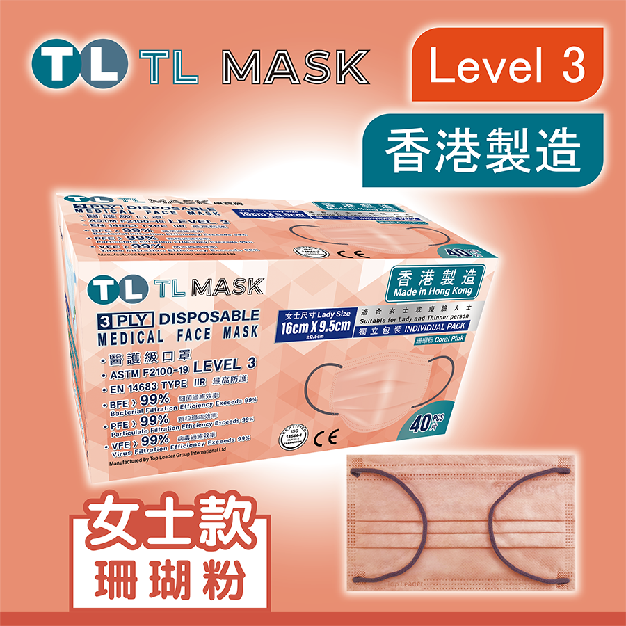 康寶牌 | TL Mask《香港製造》女士珊瑚粉色口罩 40片 ASTM LEVEL 3 BFE /PFE /VFE99 | HKTVmall ...