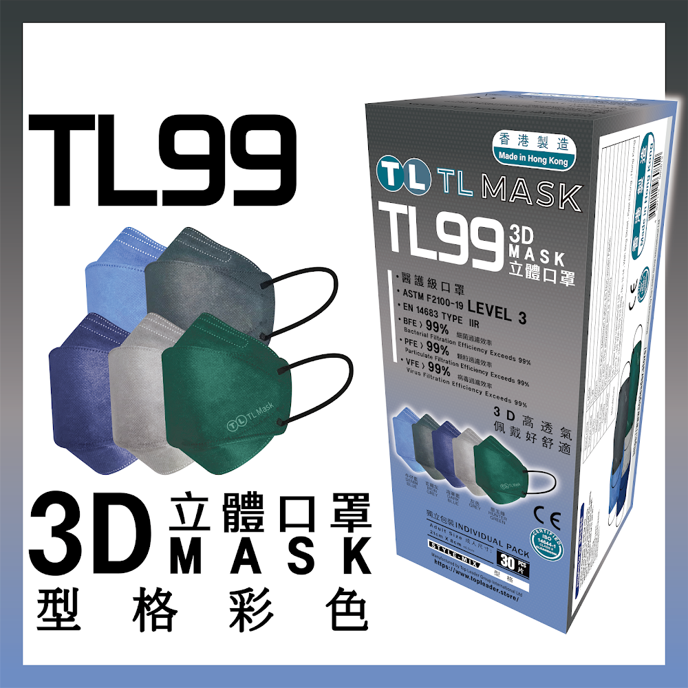康寶牌 | TL Mask《香港製造》成人TL99 型格彩色立體口罩 30片 ASTM LEVEL 3 BFE /PFE /VFE99 #香港 ...