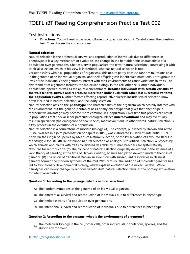 TOEFL iBT Reading Comprehension Practice Test 002 | PDF | Natural ...
