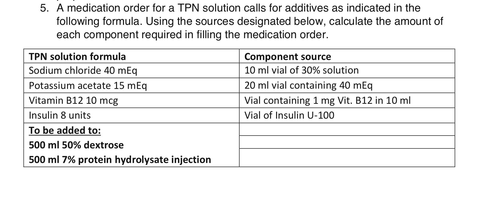 Solved 5. A medication order for a TPN solution calls for | Chegg.com