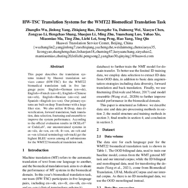 HW-TSC Translation Systems for the WMT22 Biomedical Translation Task ...