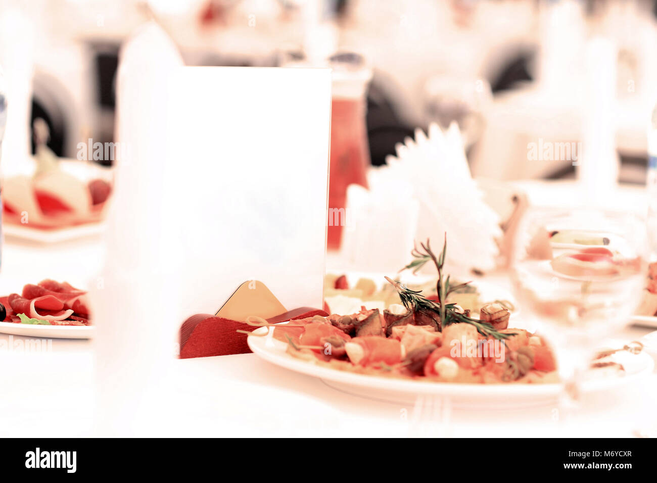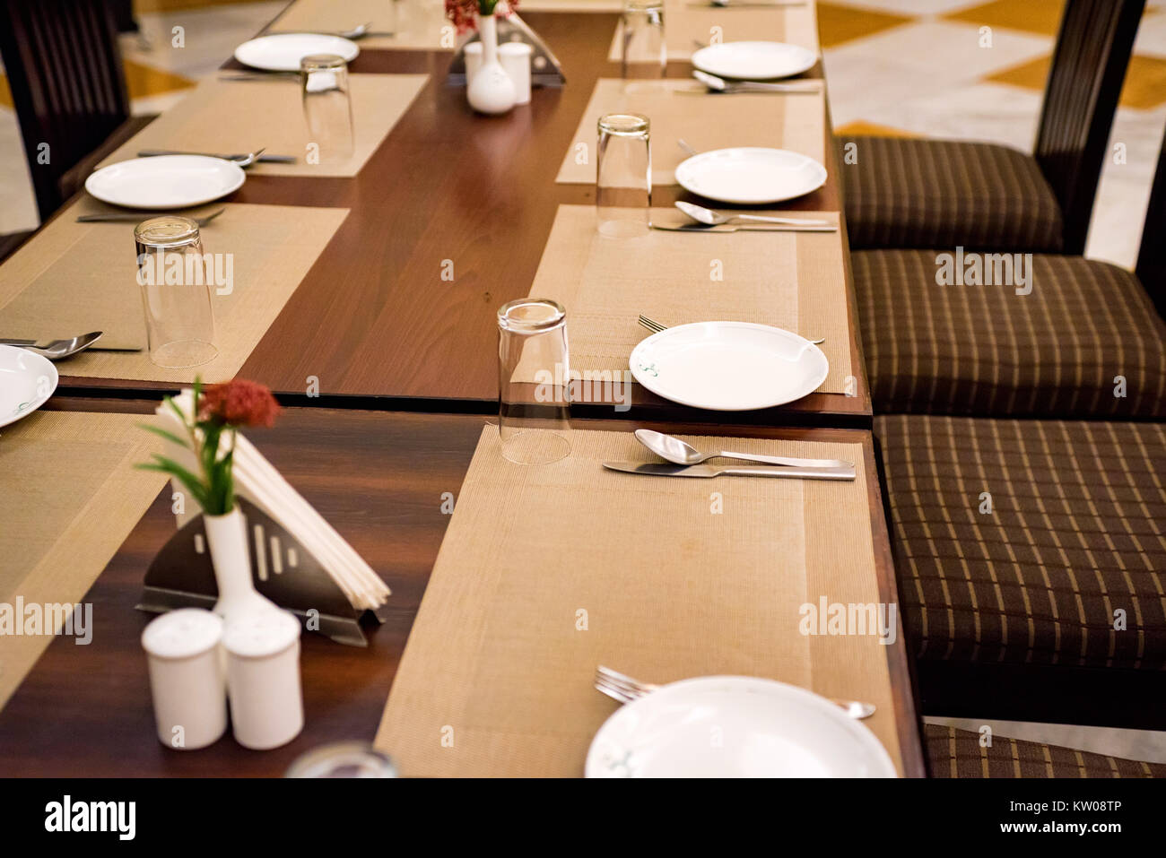 Catering table set service and glasses Stock Photo - Alamy
