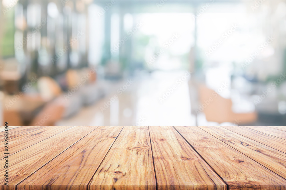 Wood table top on blurred interior reception hotel or modern hallway ...