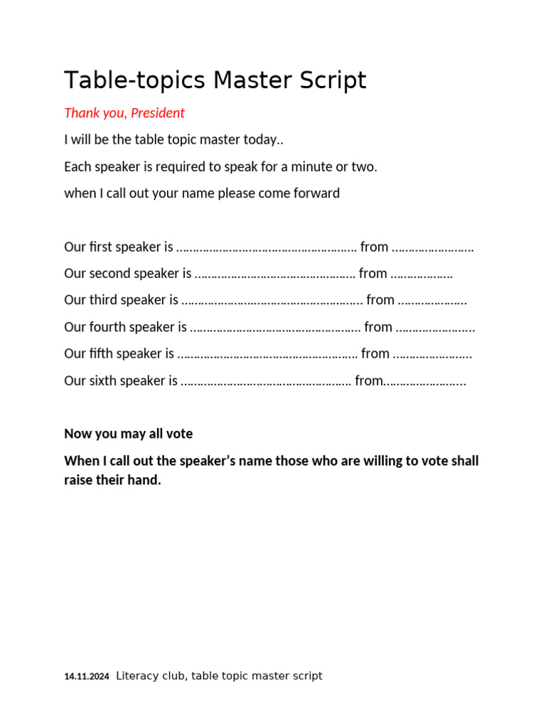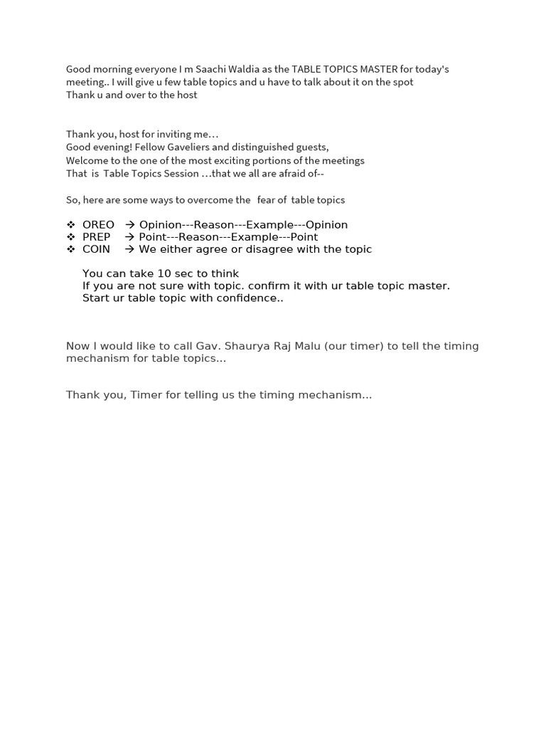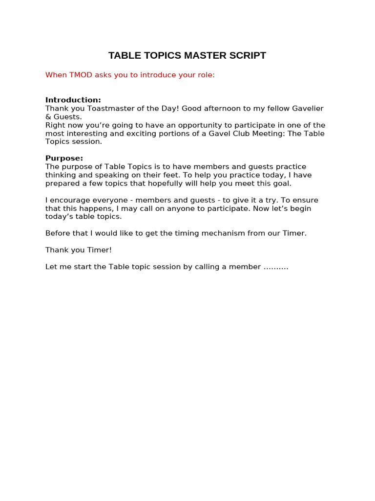 Table Topic Master Script | PDF