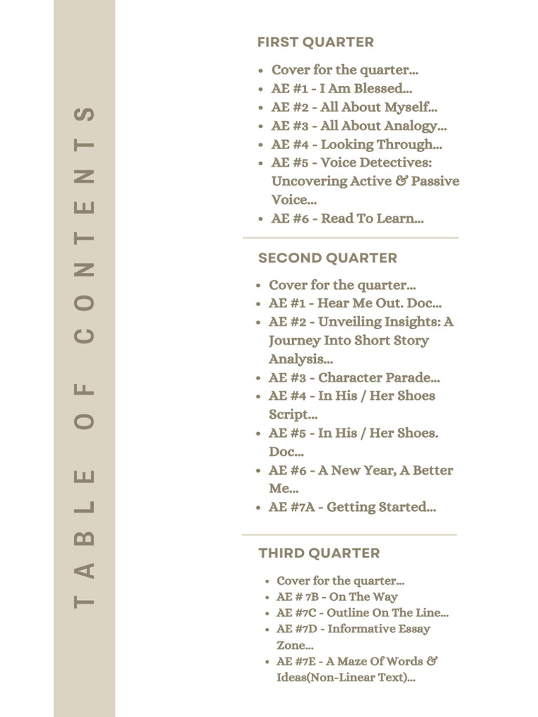 Interactive Notebook Table of Contents for ELA 7th Grade