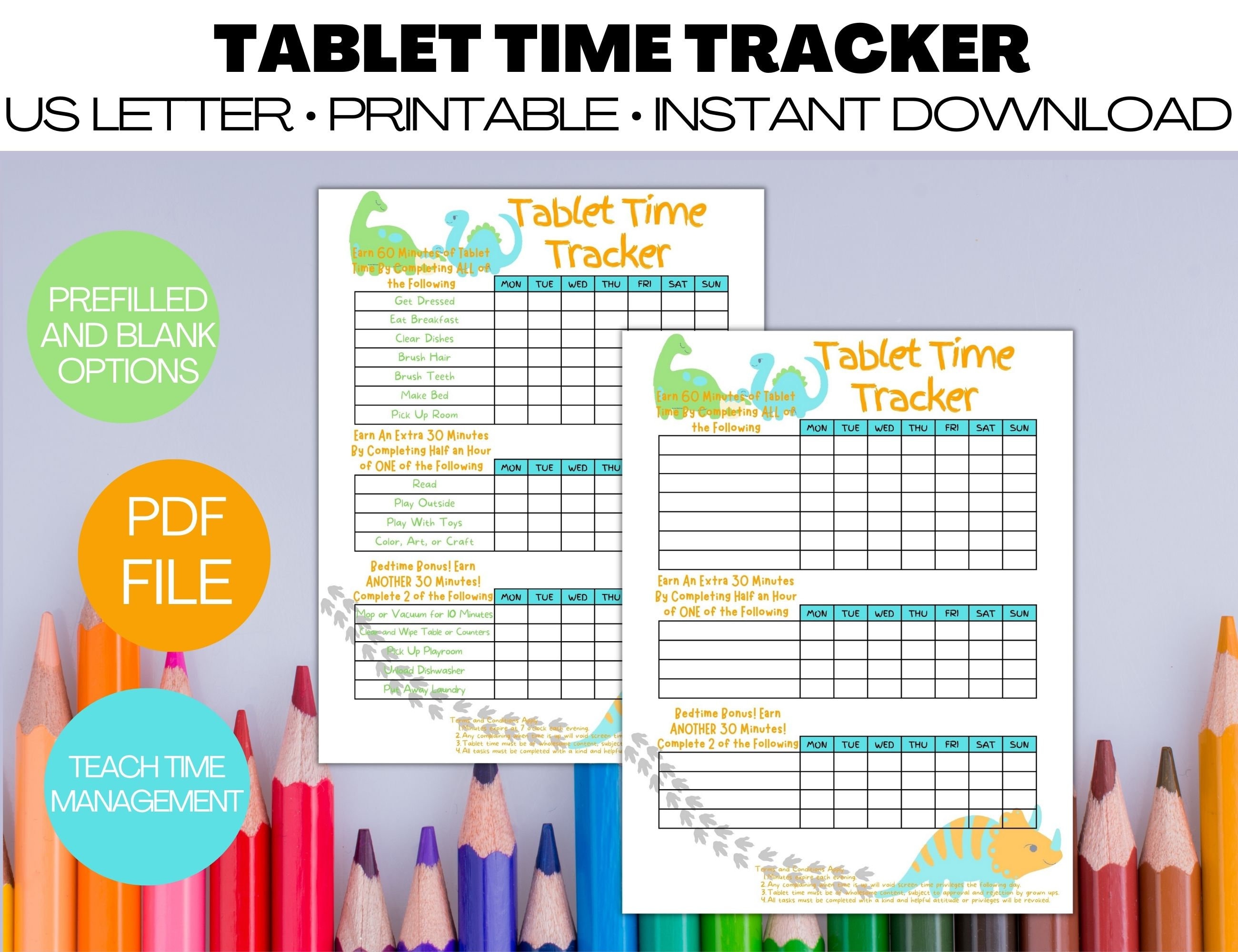 Screen Time Chart, Printable Dinosaur Themed Tablet Time Tracker, Kid's ...