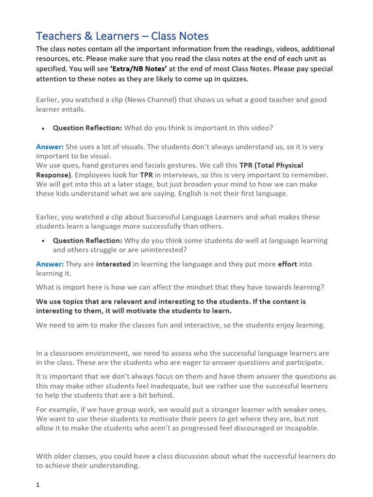 Teachers & Learners Class Notes | PDF | Teachers | Learning