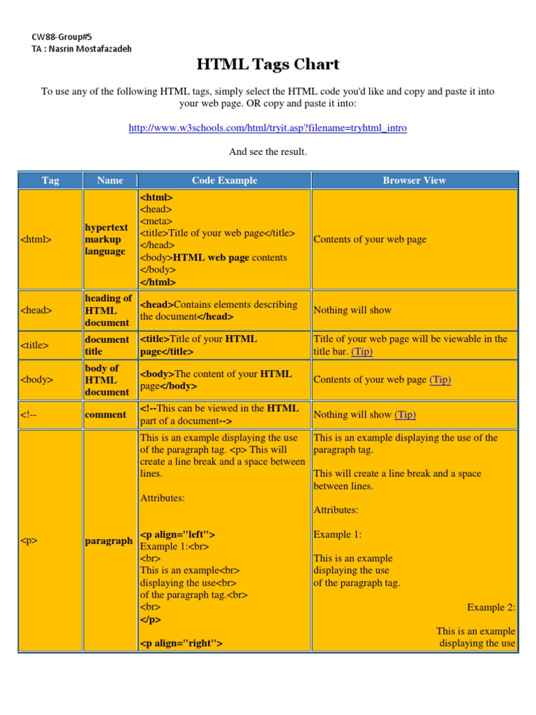 HTML Tags Chart: Tag Name Code Example Browser View | PDF | Html | Html ...