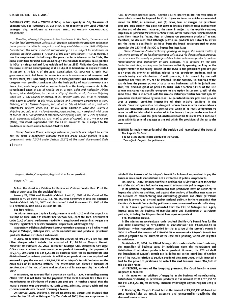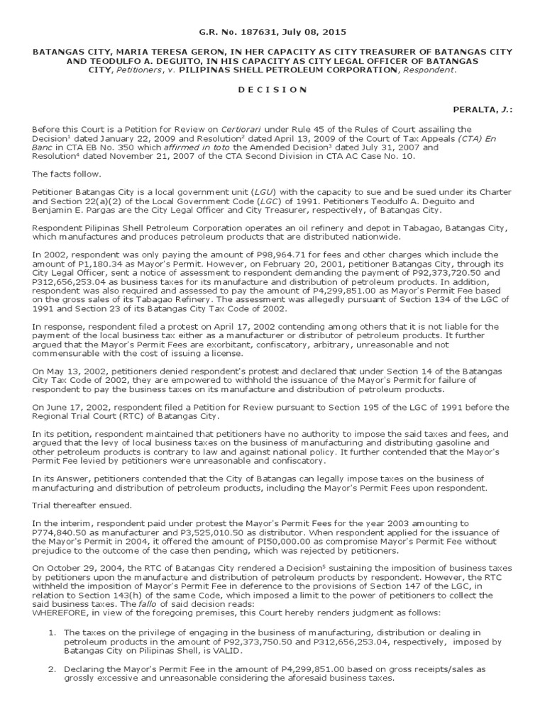 12. Taxation of Pilipinas Shell by Batangas City: Case Ruling Analysis ...