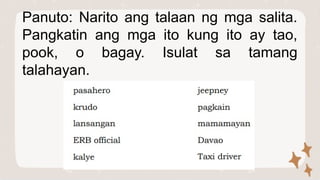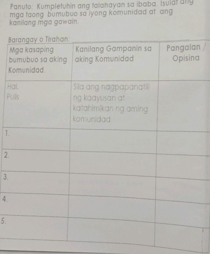 Panuto:Gamit ang talahayan sa ibaba,magtala ng Hindi bababa sa dalawa ...