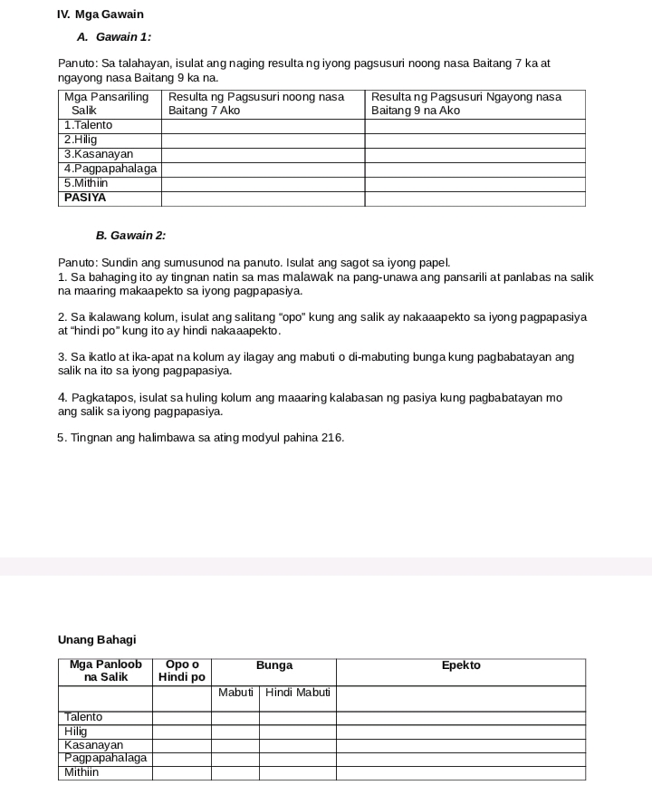 IV Mga Gawain A Gawain 1 Panuto Sa | StudyX