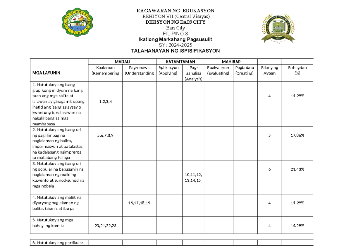 Filipino 8 Ikatlong Markahang Pagsusulit: Talahayan ng Isipisikasyon ...