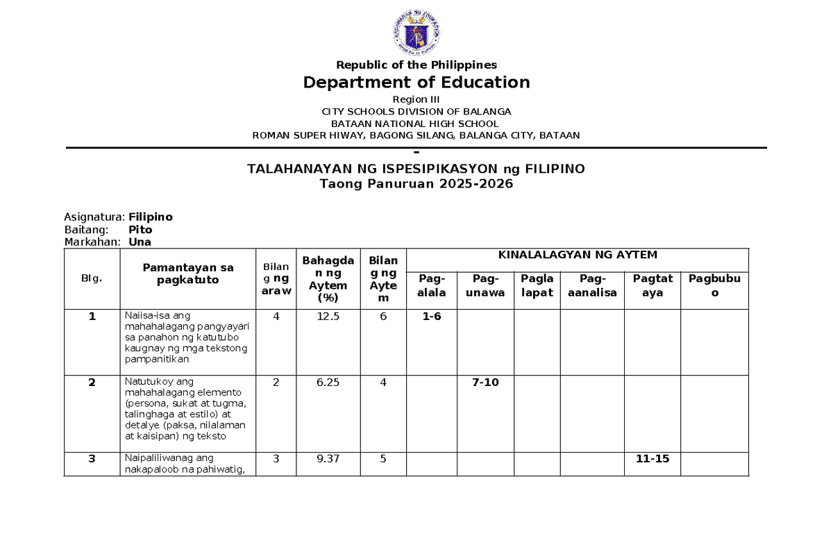 TOS-FIL7-Q1: Talahayan ng Ispesipikasyon sa Filipino Baitang Pito - Studocu