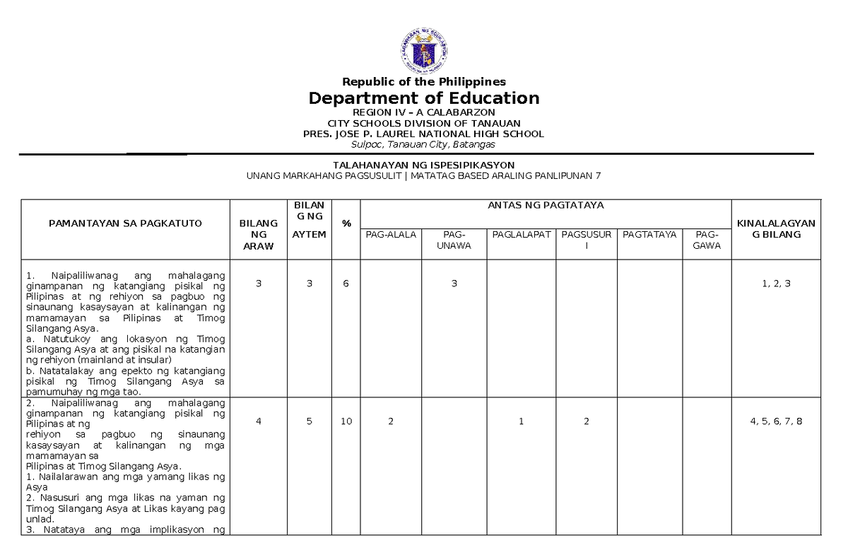 323109169 Talahanayan Ng Ispesipikasyon Sa Unang Panahunang Pagsusulit ...