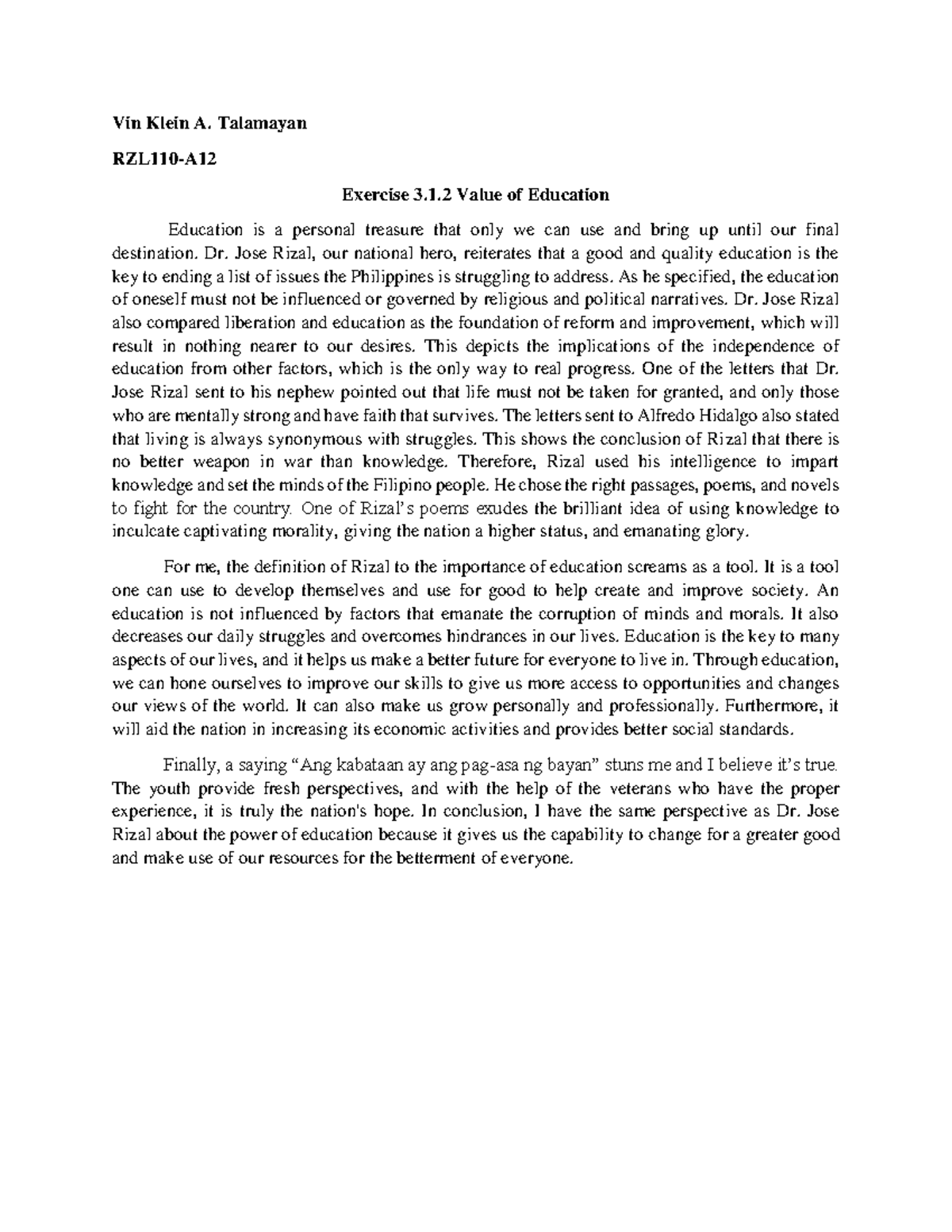 Talamayan-Exercise 3 - Vin Klein A. Talamayan RZL110-A Exercise 3.1 ...