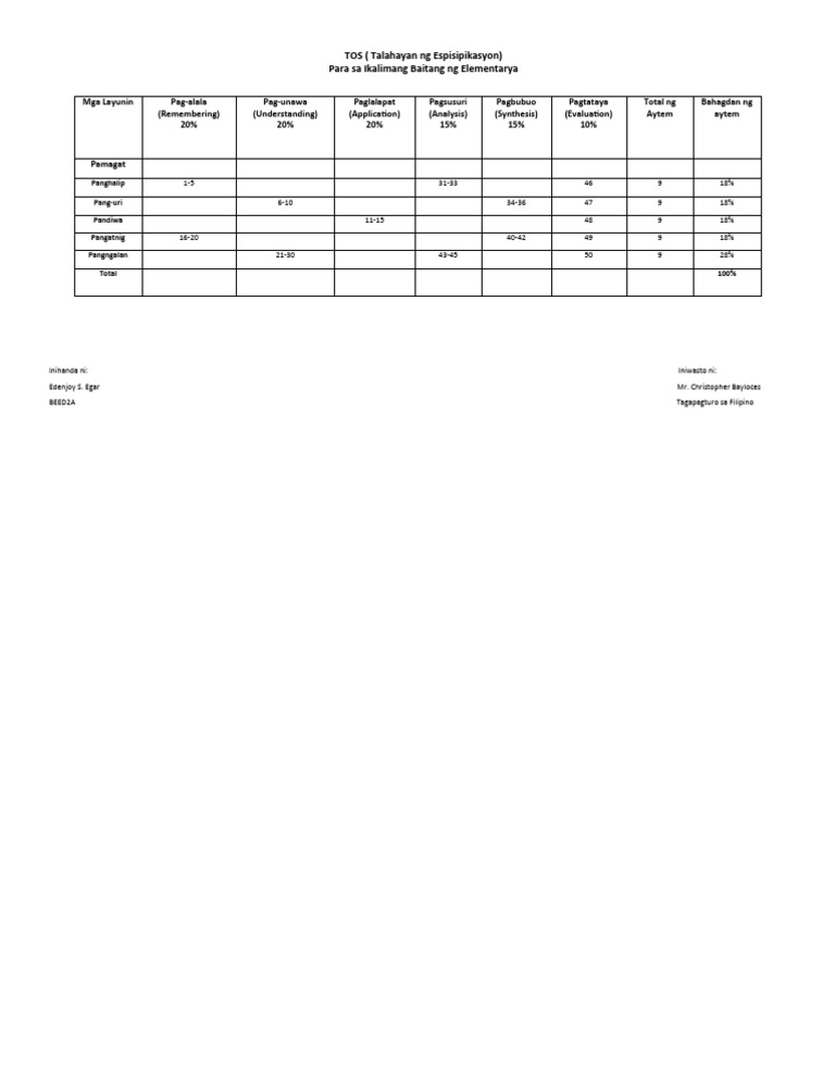 TOS (Talahayan NG Espisipikasyon) para Sa Ikalimang Baitang NG ...