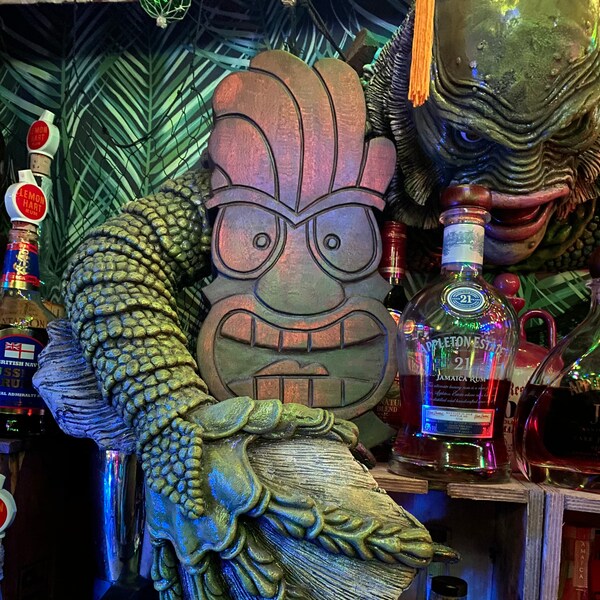 Tiki TOny Tangaroa mug and carvings | Tiki statues, Tiki art, Tiki decor