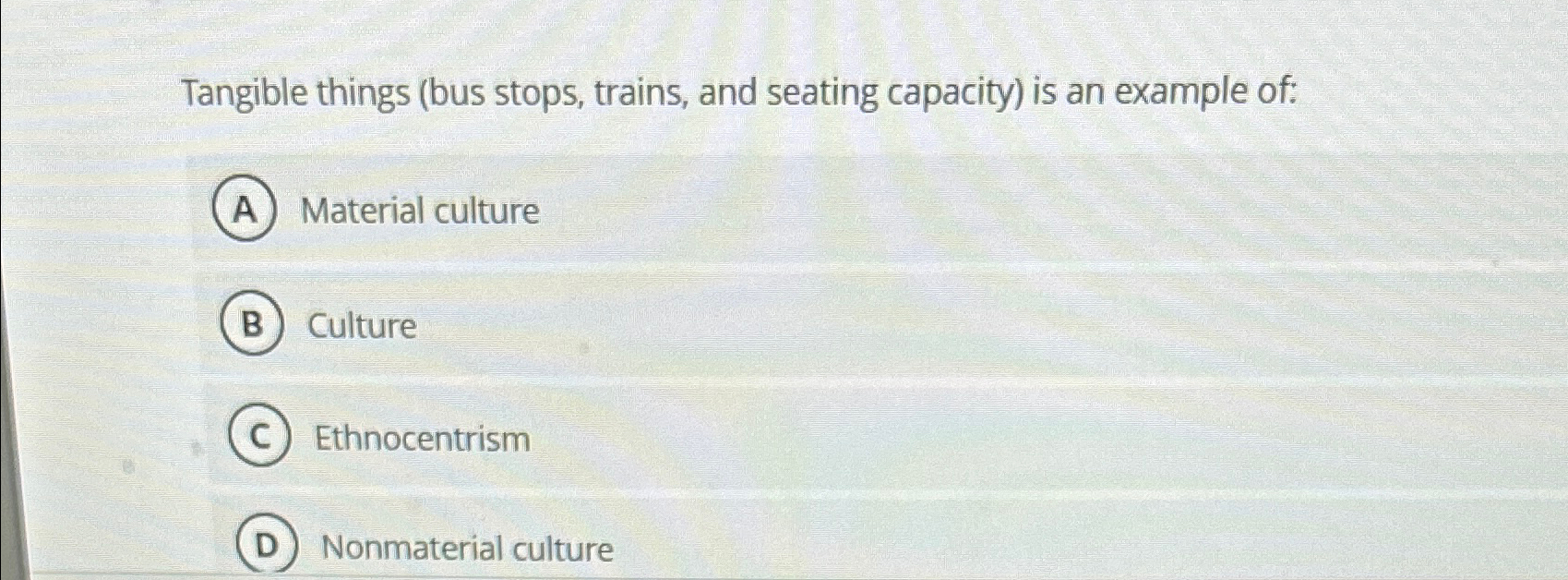 Solved Tangible things (bus stops, trains, and seating | Chegg.com