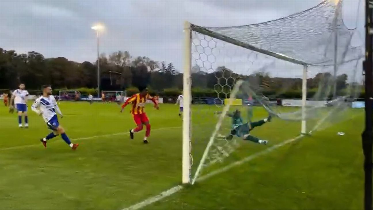 Goalkeeper's stunning point-blank save while tangled in net - ESPN