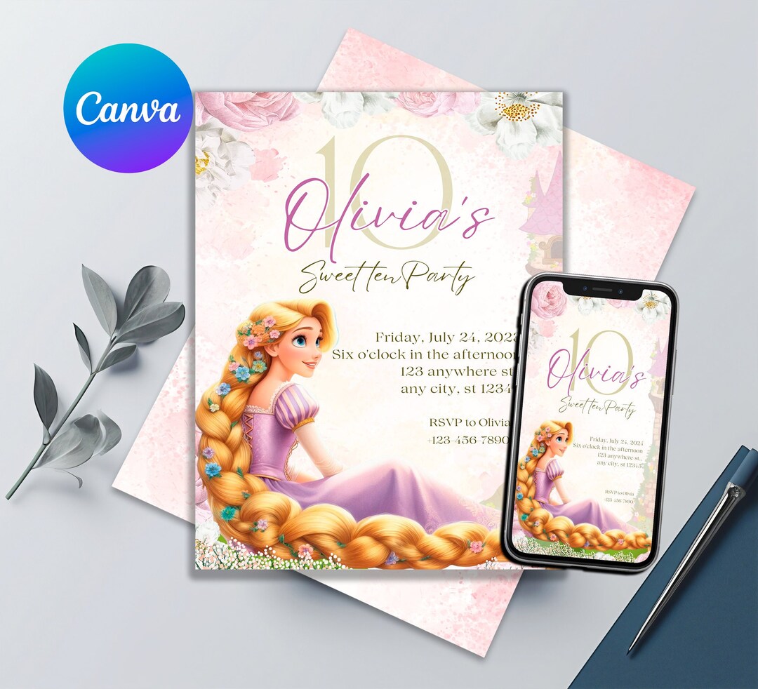 Tangled Rapunzel Birthday Invitation: Princess Party - Editable Canva ...