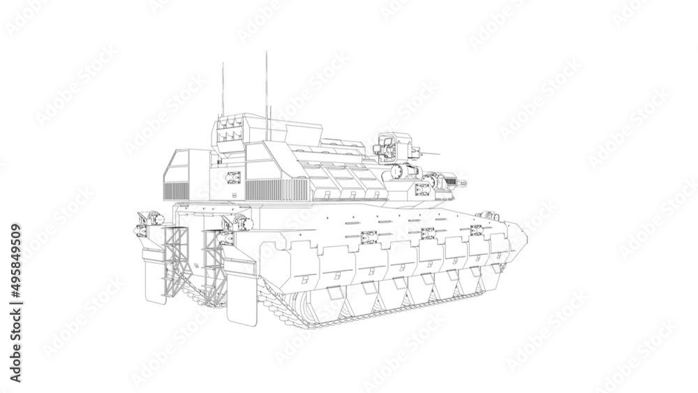 Loop rotation animation of a military tank wireframe with thin black ...