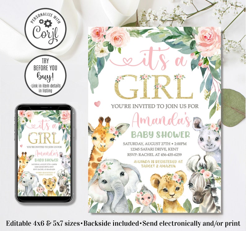 Editable Safari Baby Shower Invitation, It's A Girl Baby Shower ...