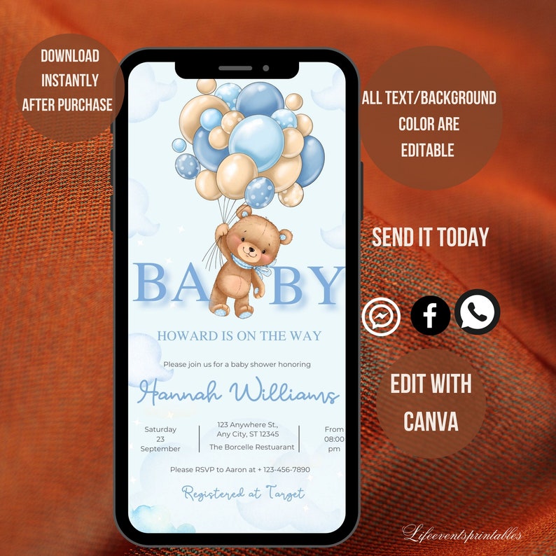 Digital Boy Baby Shower Invitation Templates, Electronic Bear Baby ...