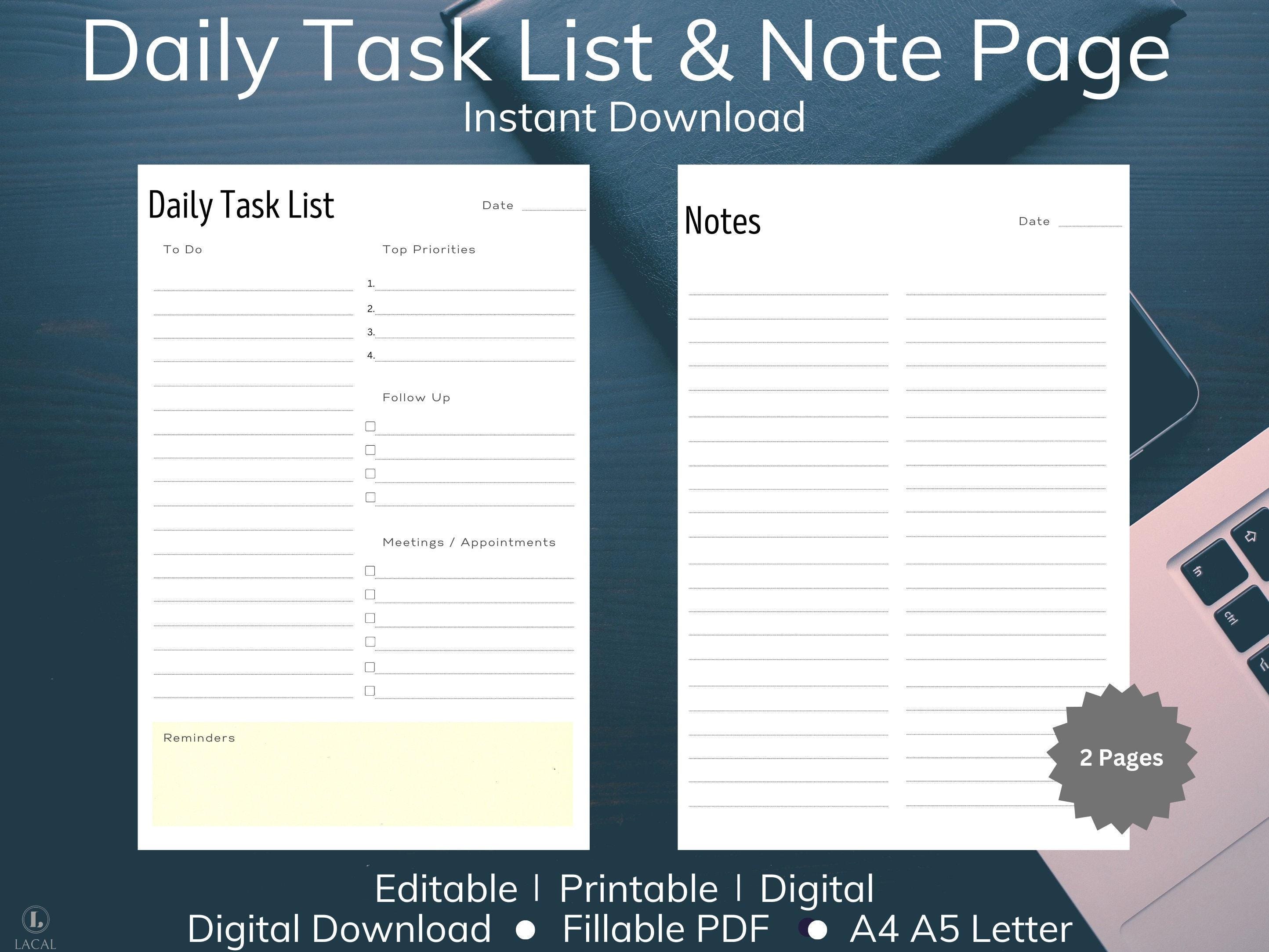 Daily Task List & Notes Page, Digital Printable and Fillable Pages for ...