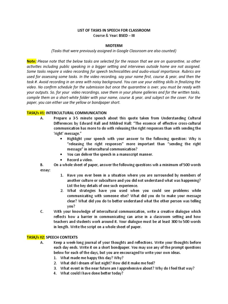 Speech Tasks for BSED Students | PDF | Cross Cultural Communication ...