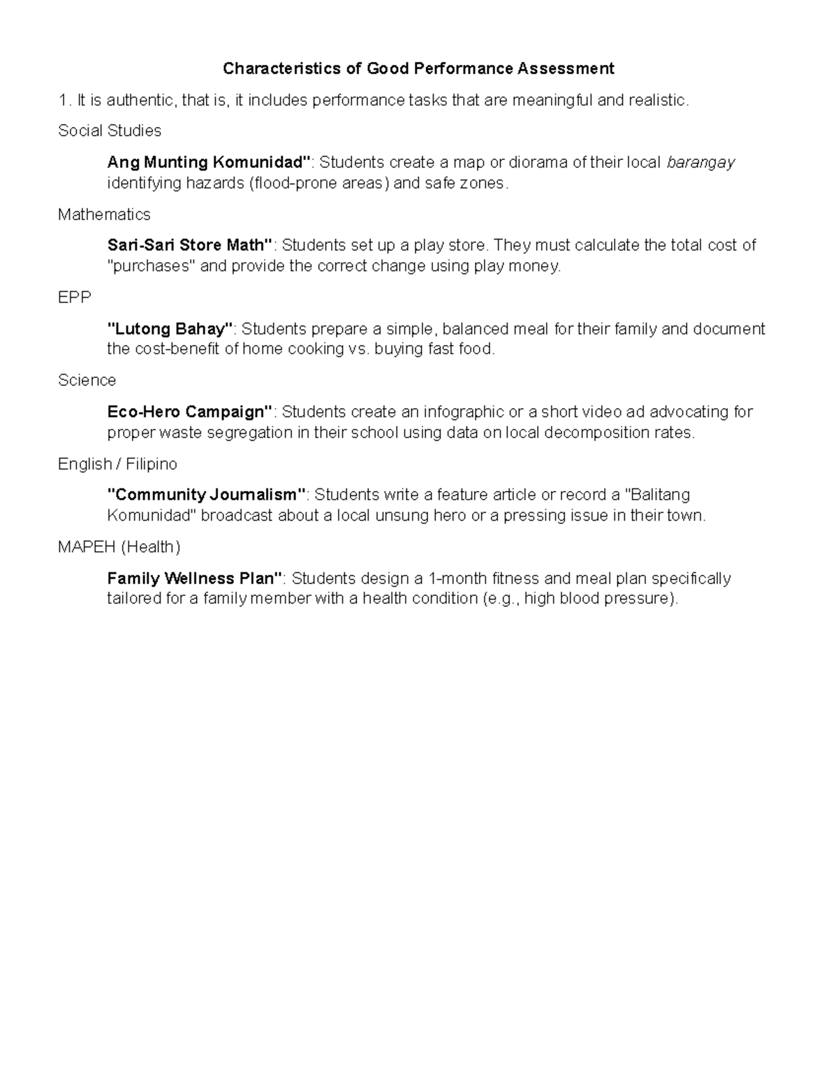 Examples of Good Performance Assessment Tasks in Various Subjects - Studocu