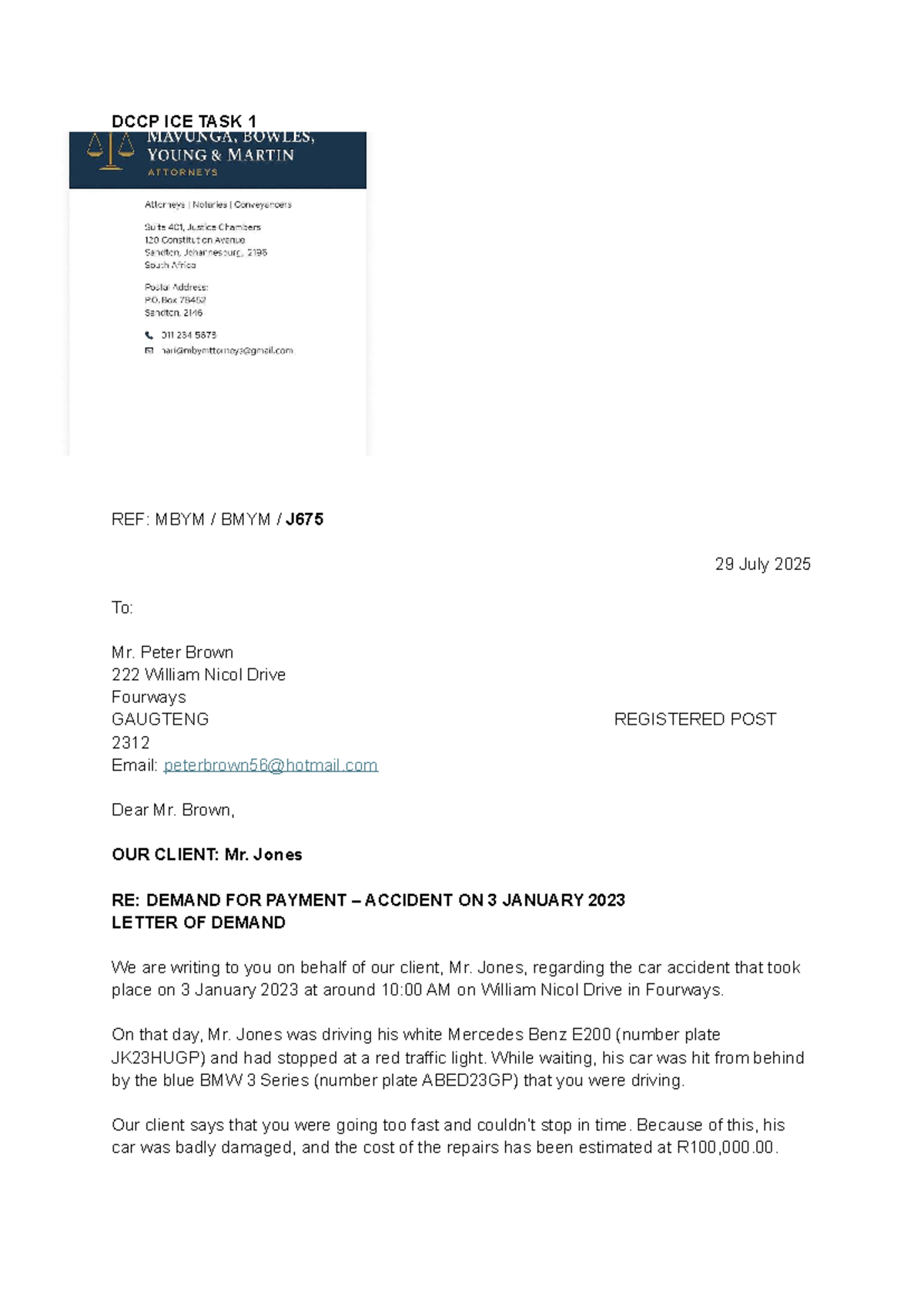 DCCP ICE TASK 1 & 2 - Legal Demand Letters for Payment - Studocu