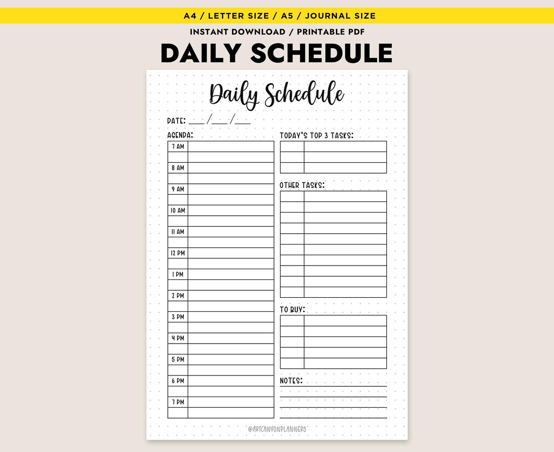 Daily Schedule Printable PDF Hourly Agenda Top Tasks Notes A4 A5 Letter ...