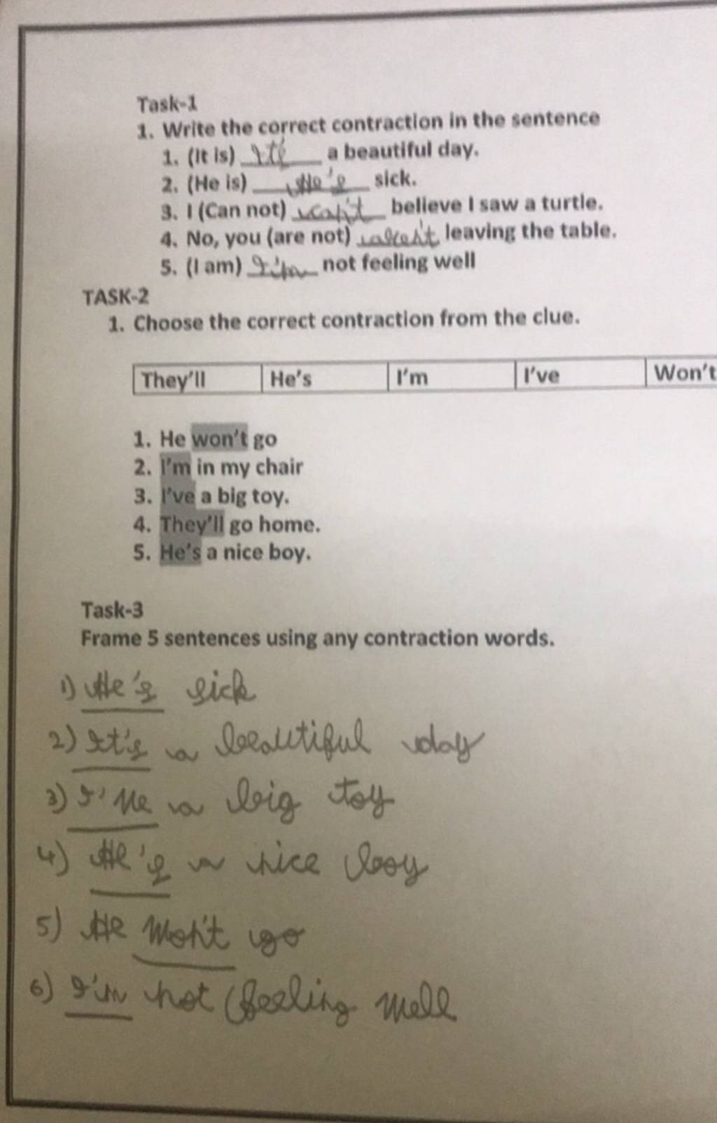 Task-1 1. Write the correct contraction in the sentence 1. (it is) Lte a