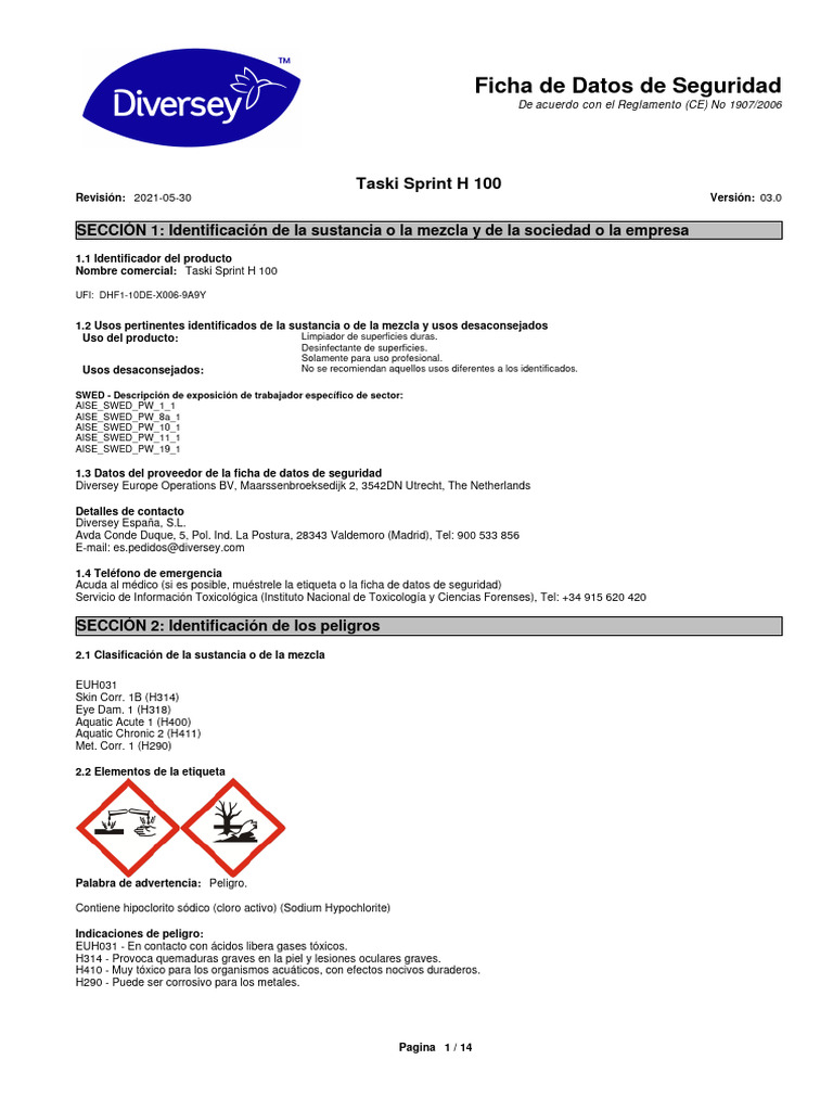 Ficha de Seguridad Taski Sprint H 100 | PDF | Cloro | Solubilidad