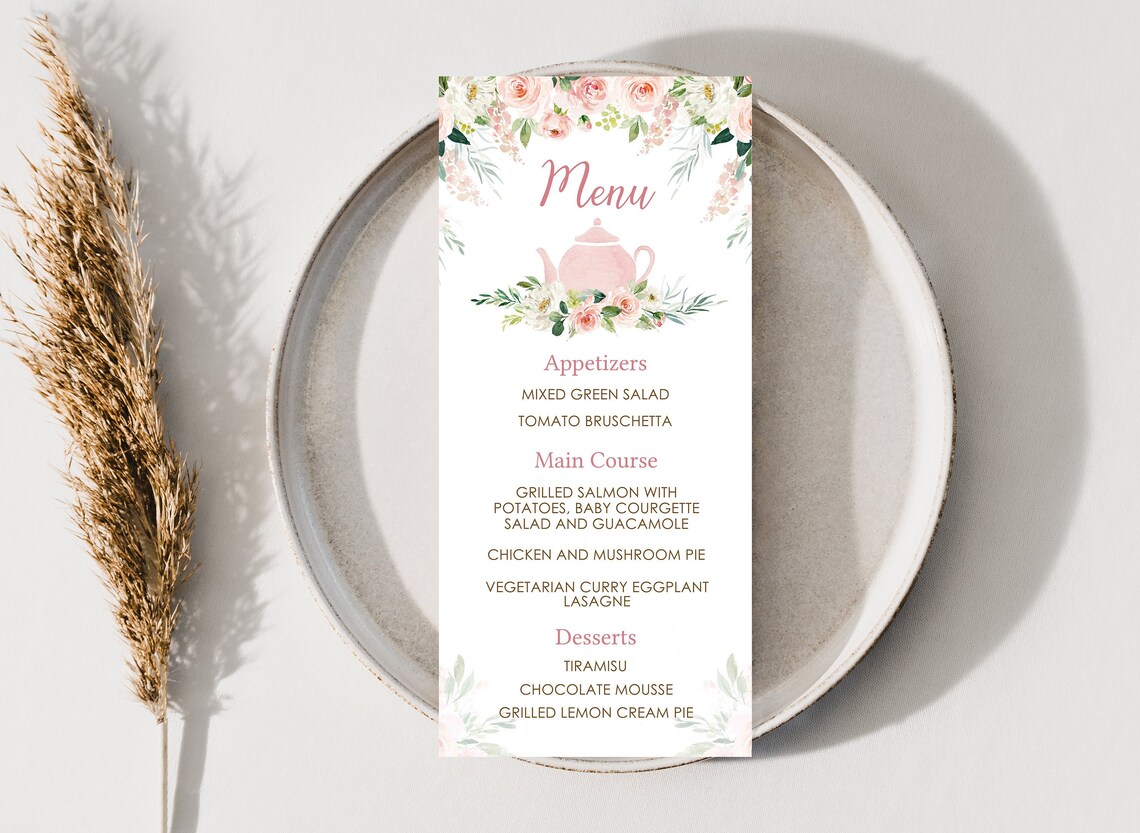 Editable Tea Party Menu Template, Floral Tea Menu Card, Bridal Tea Menu ...