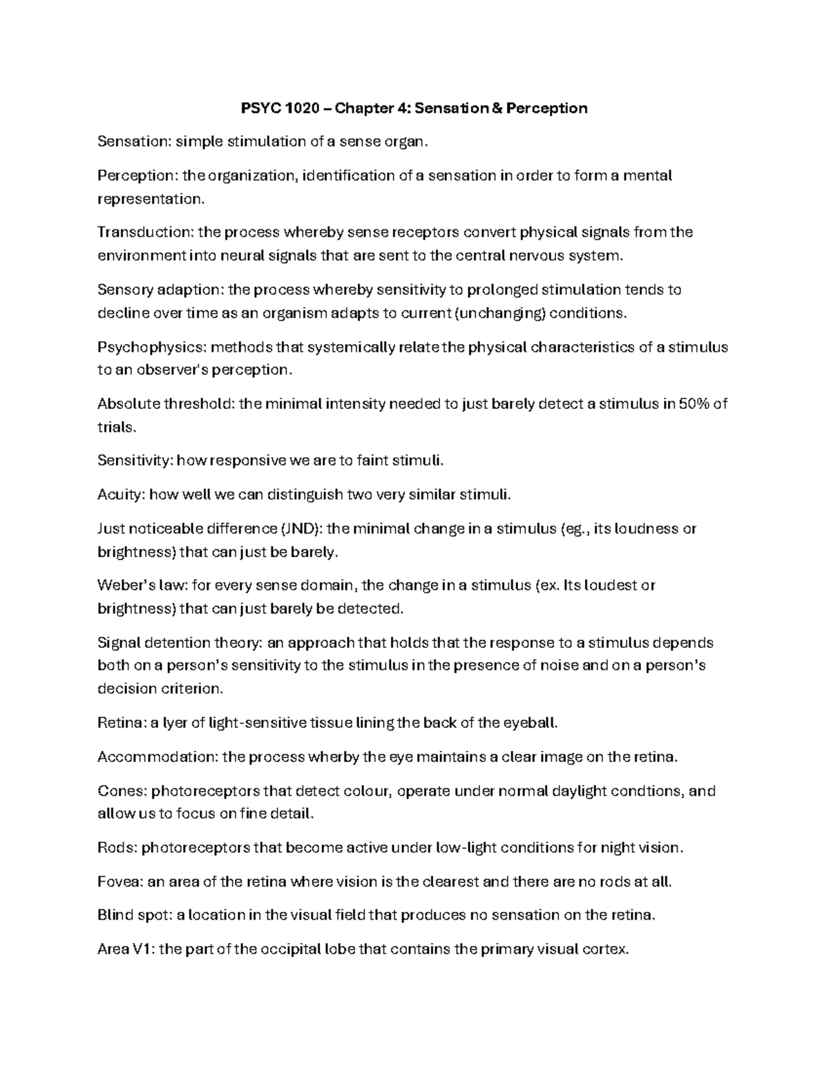 PSYC 1020 – Chapter 4: Sensation & Perception - Studocu