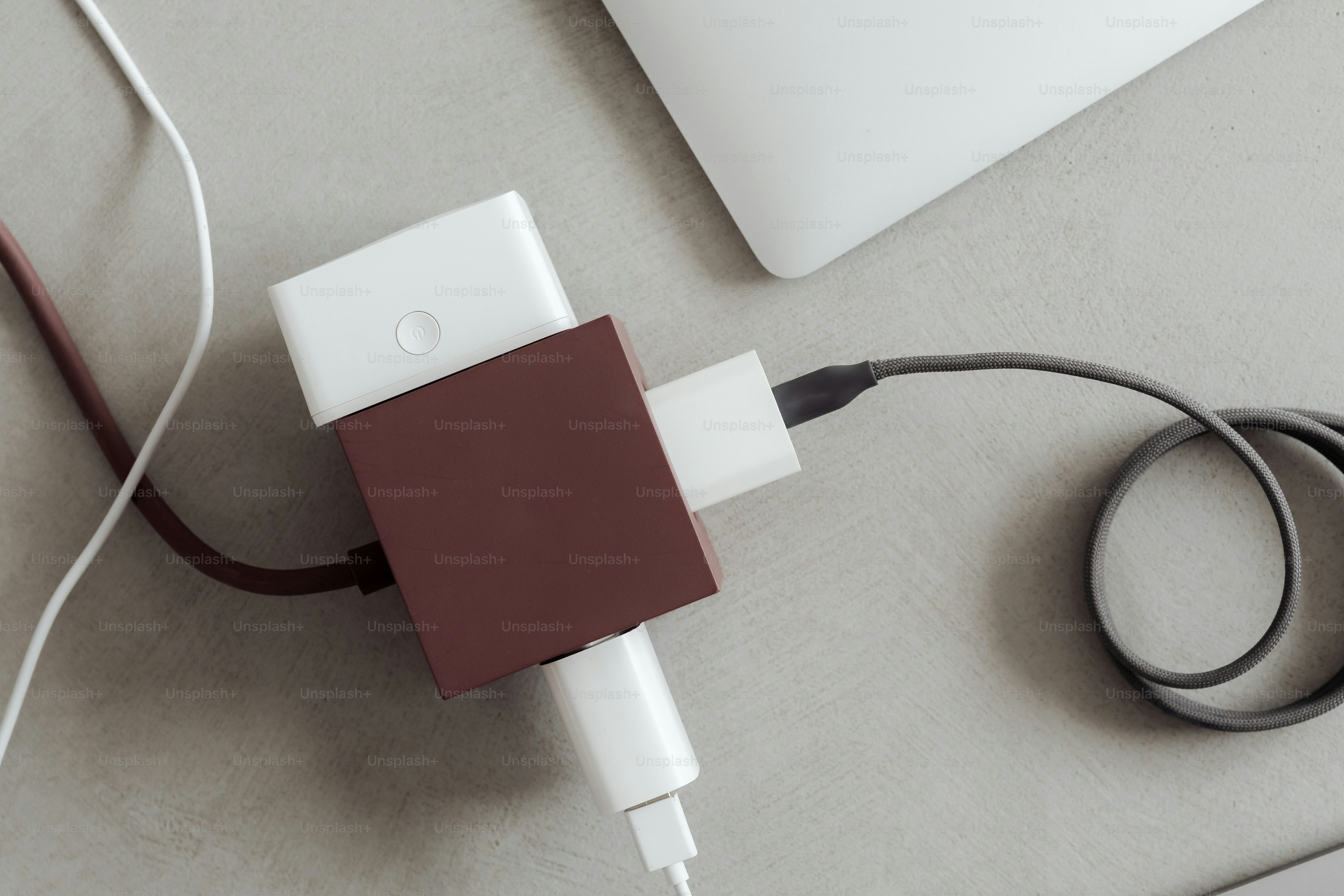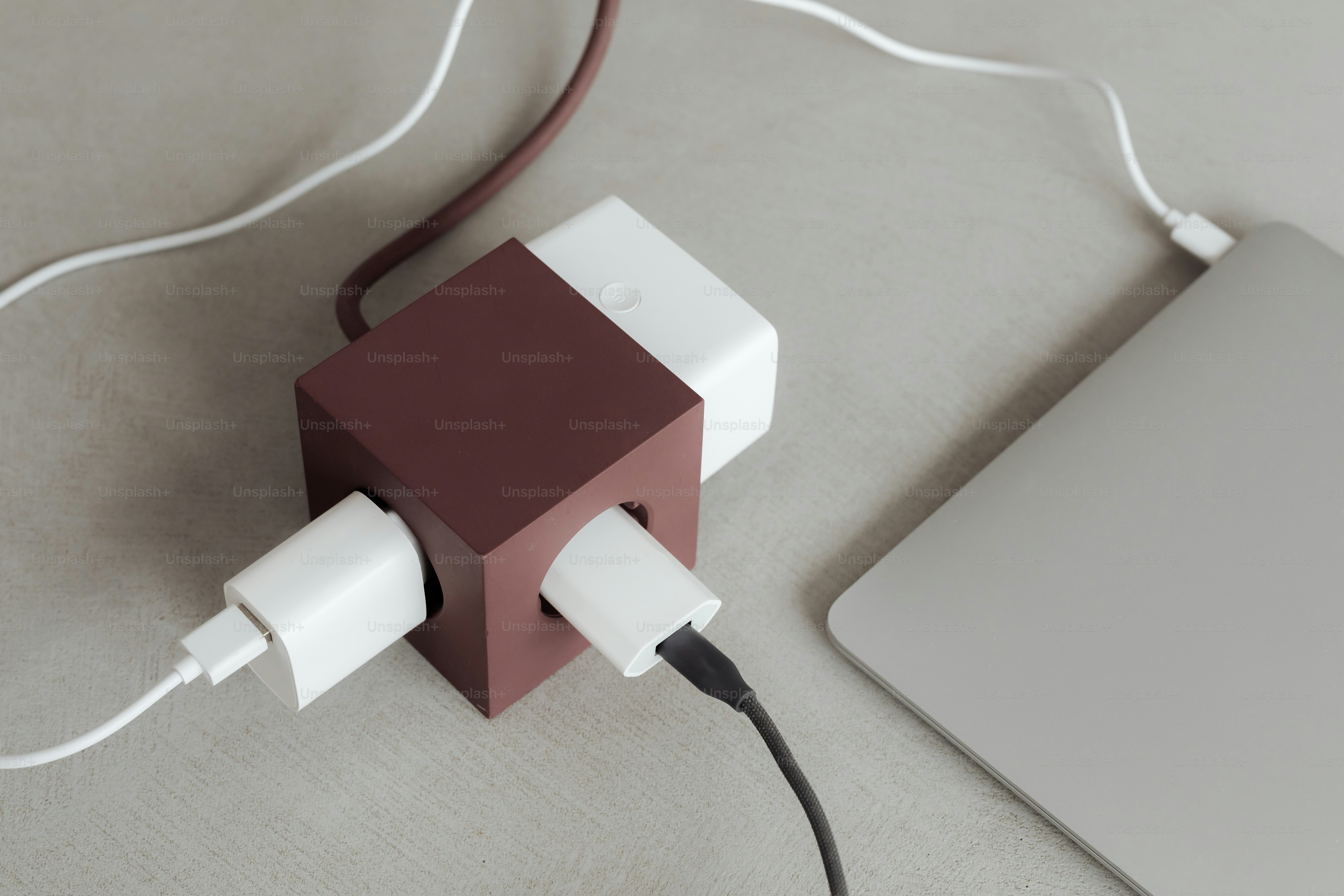 Multiple white chargers plugged into a maroon cube adapter. photo ...