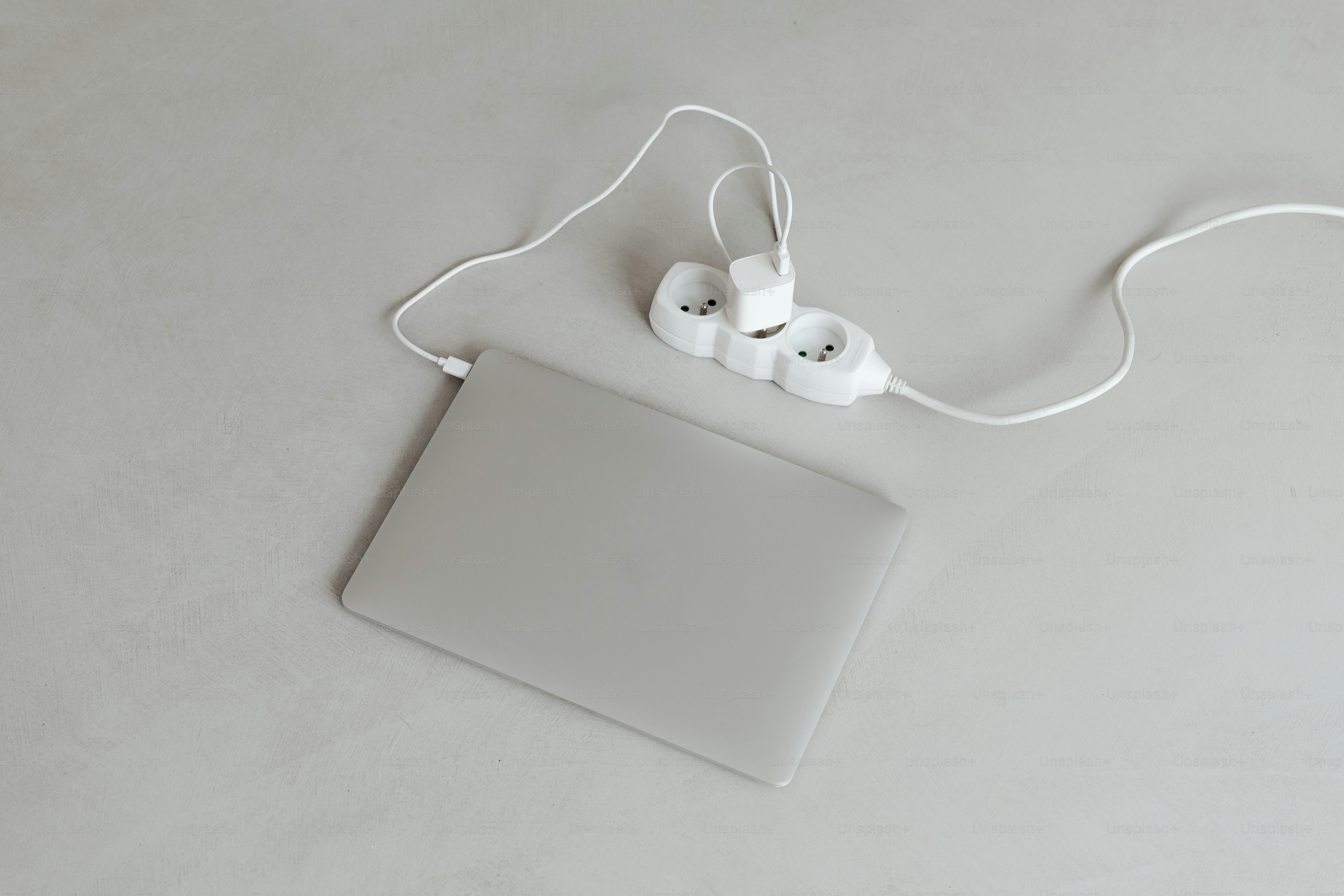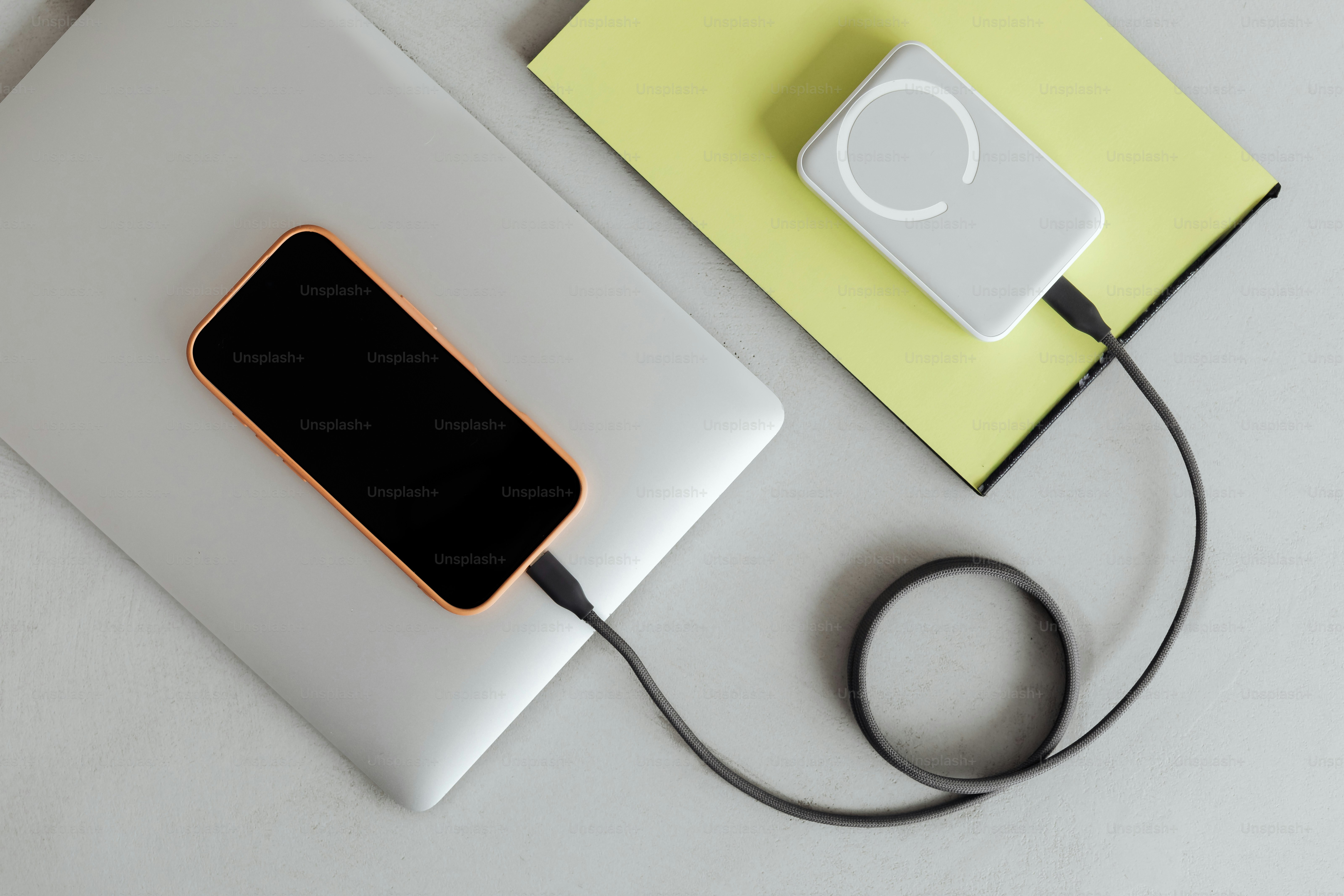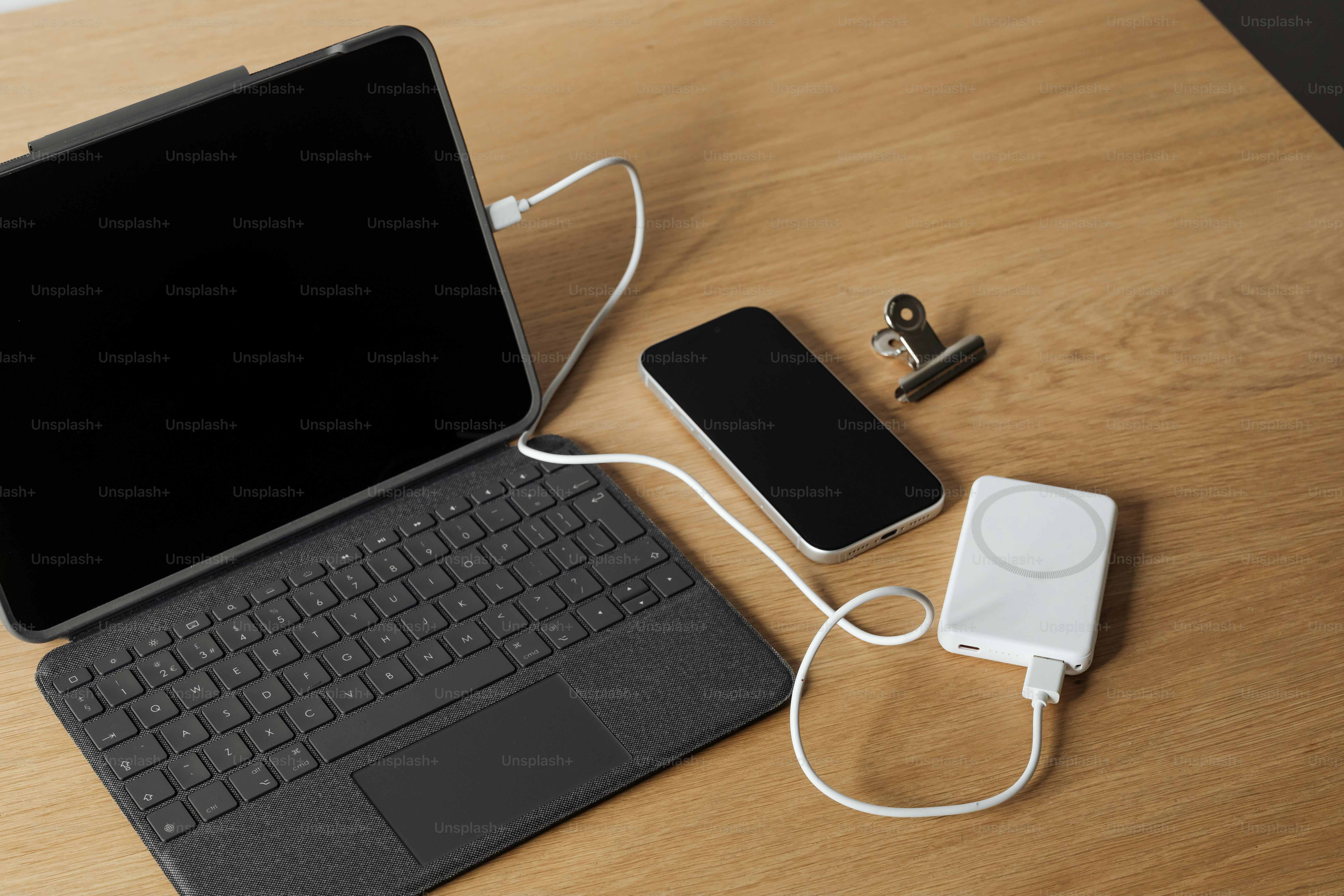 Laptop, phone, and power bank charging on desk. photo – Technology ...