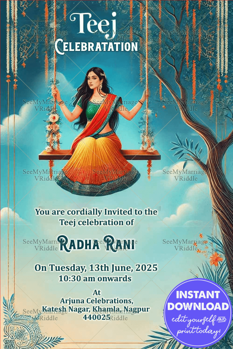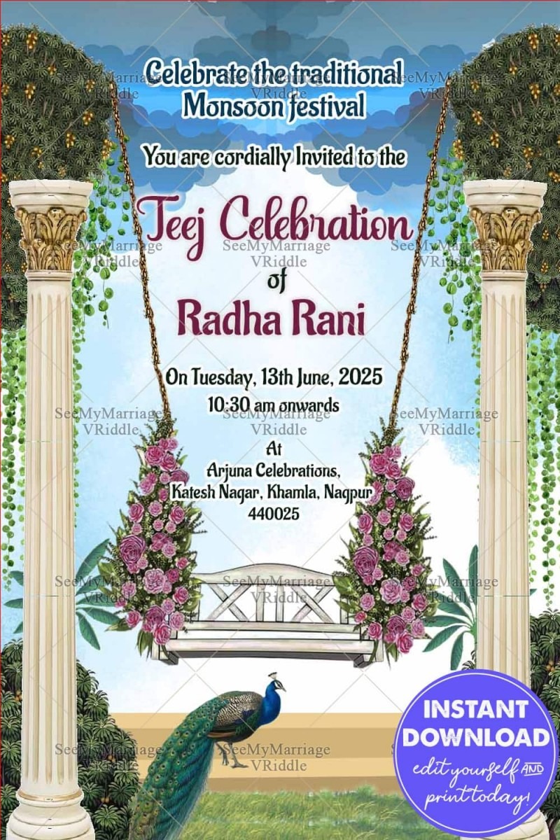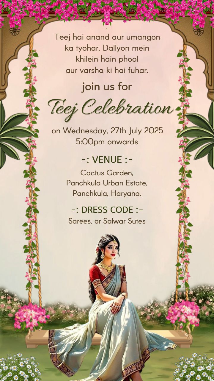 Vibrant Teej Festival Celebration Invitation with Floral Swing Theme ...