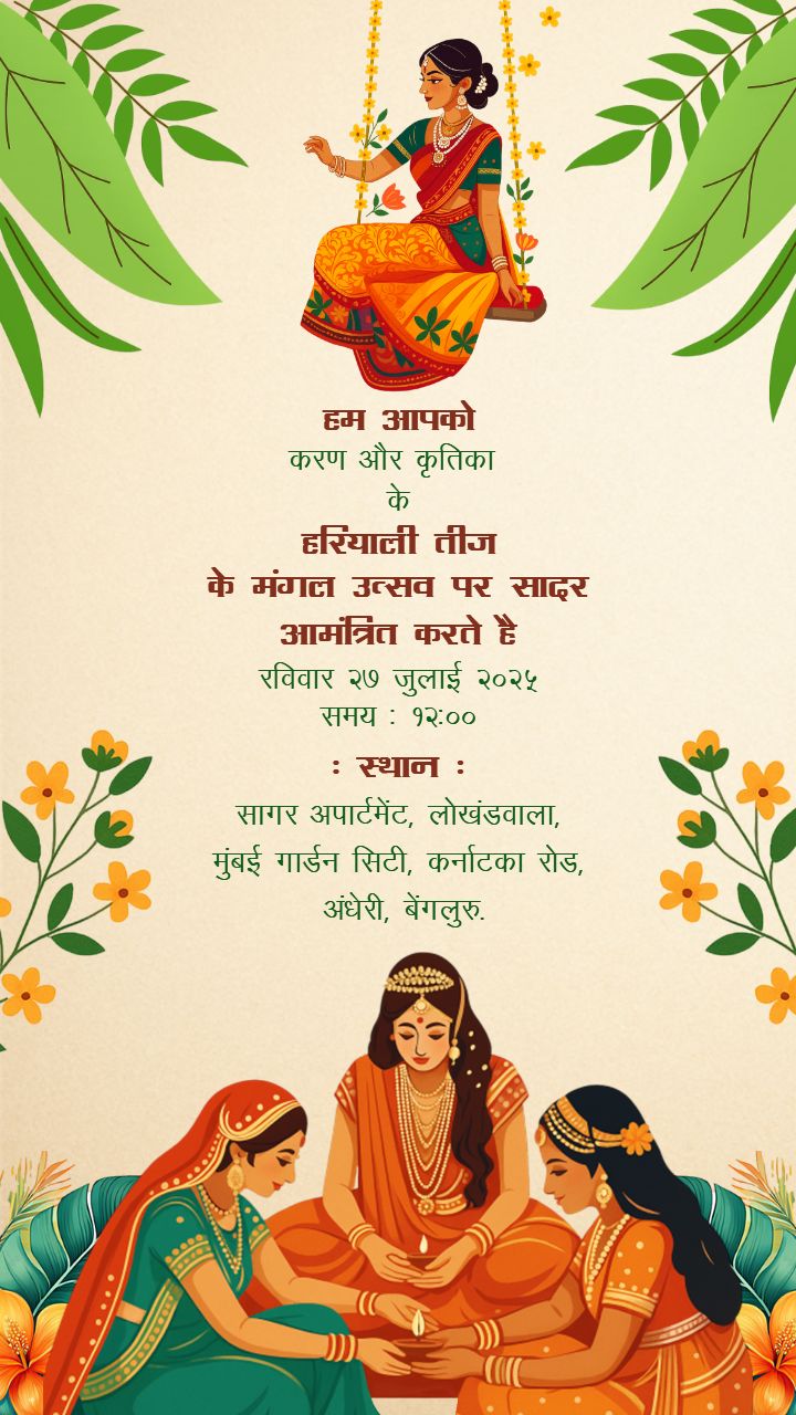 Traditional Hariyali Teej Invitation card with Floral Swing Theme and ...
