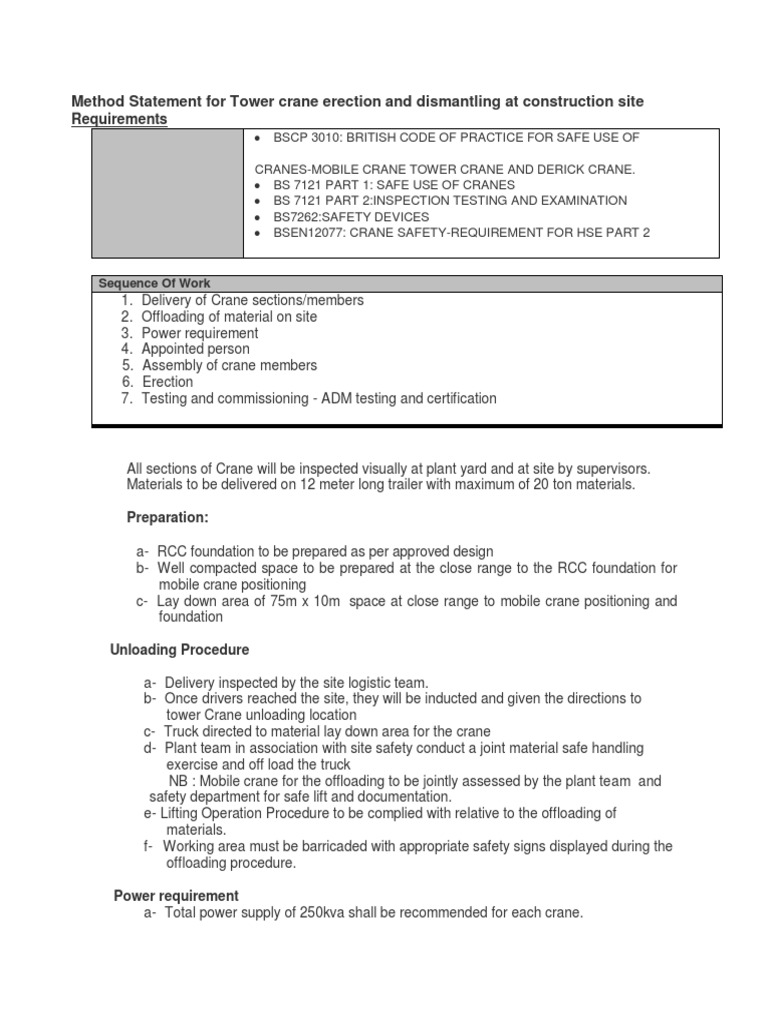 Method Statement For Tower Crane | PDF | Crane (Machine) | Manufactured ...