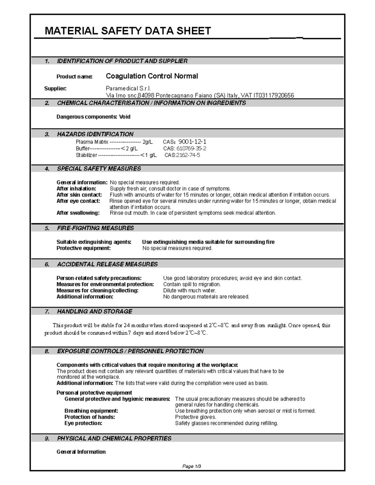 MSDS for Coagulation Control Reagent (9.2) - Studocu