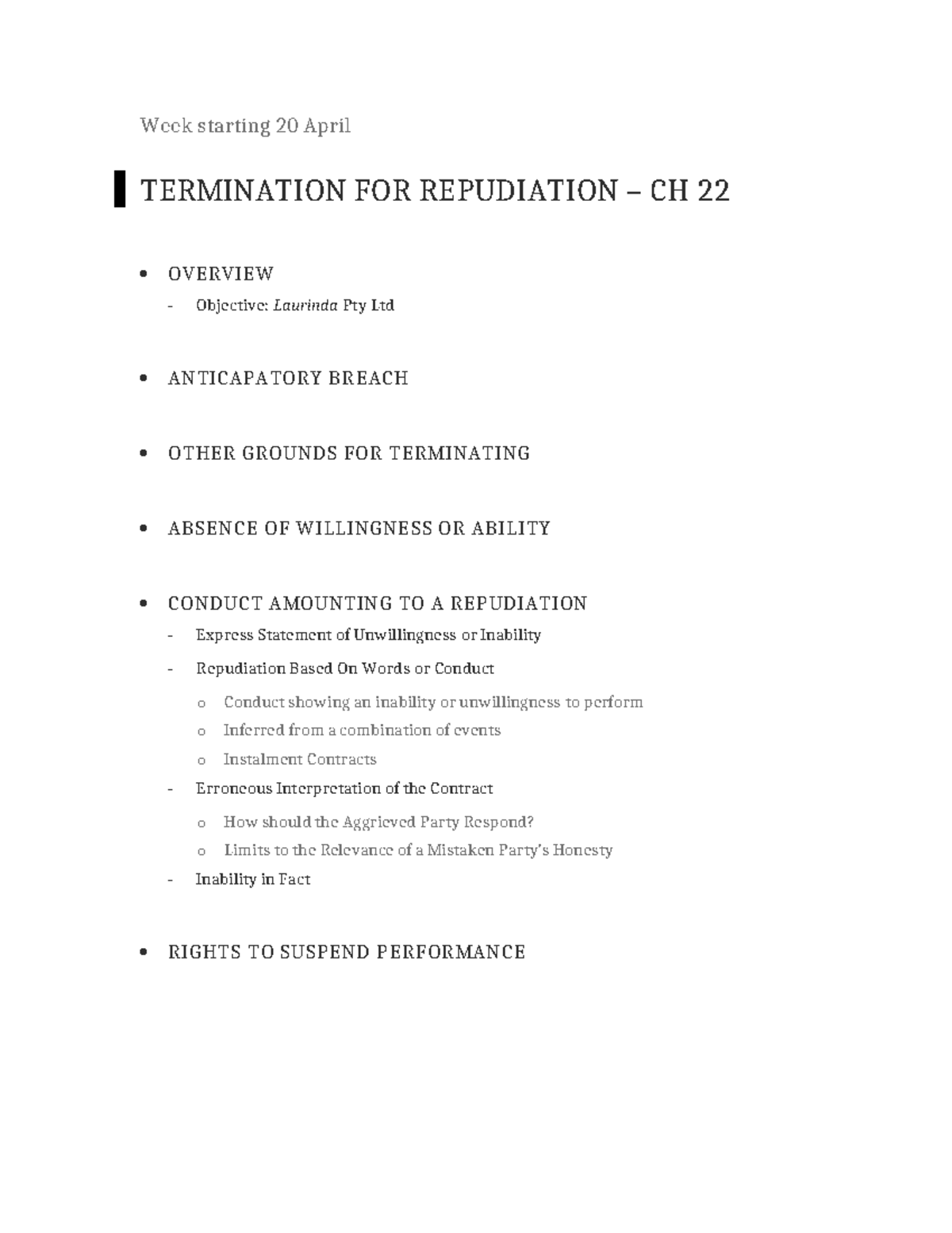 Contract Outline: Termination for Repudiation (Ch 22) Overview - Studocu